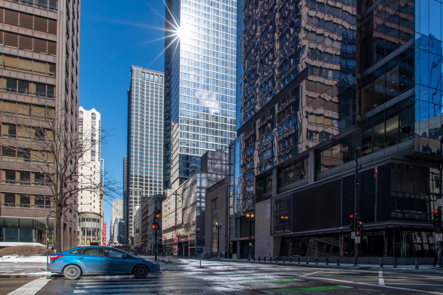 Зеркальные высотки иногда освещают улицы, отражая солнце