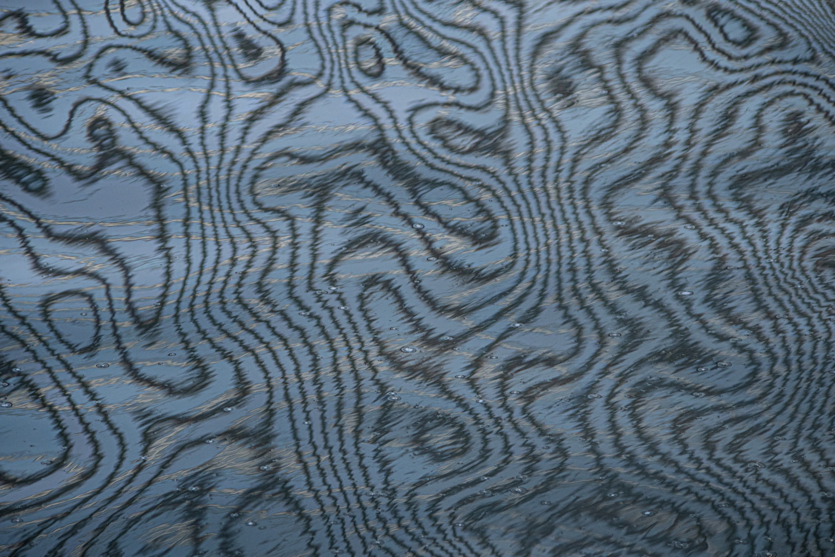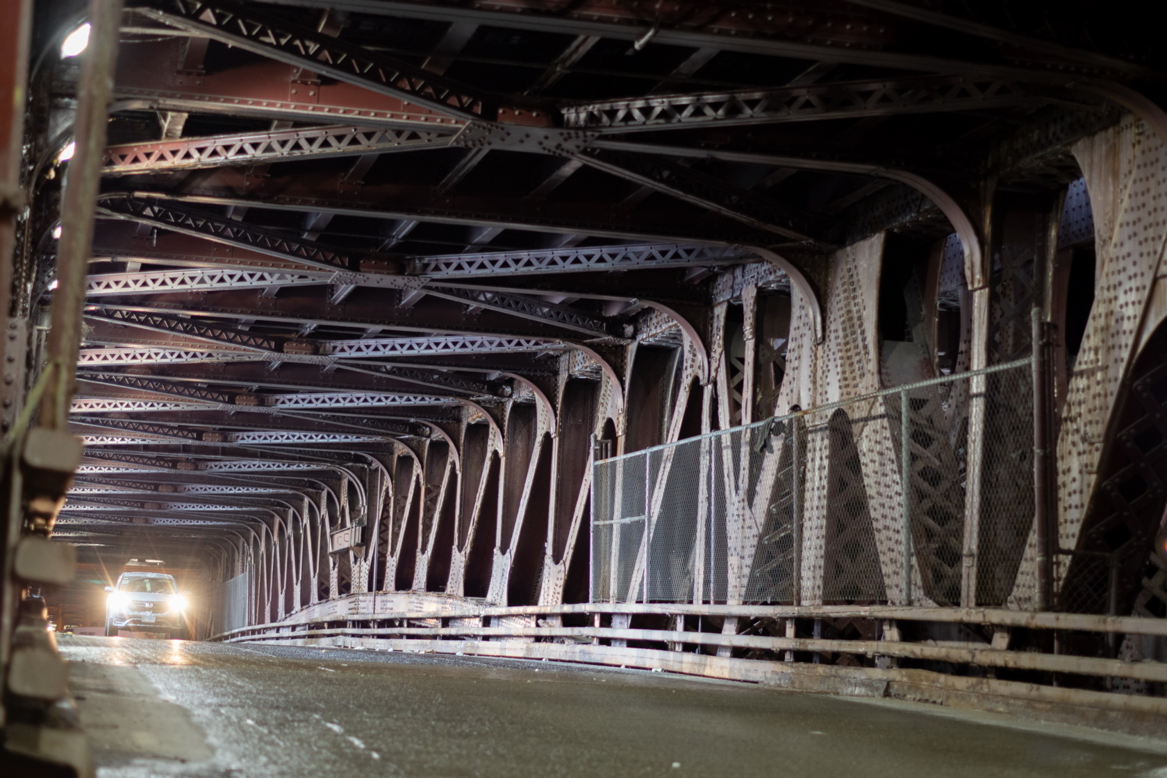 На поверхности воды в реке возникают магические узоры, когда рядом по железному мосту проезжает автомобиль